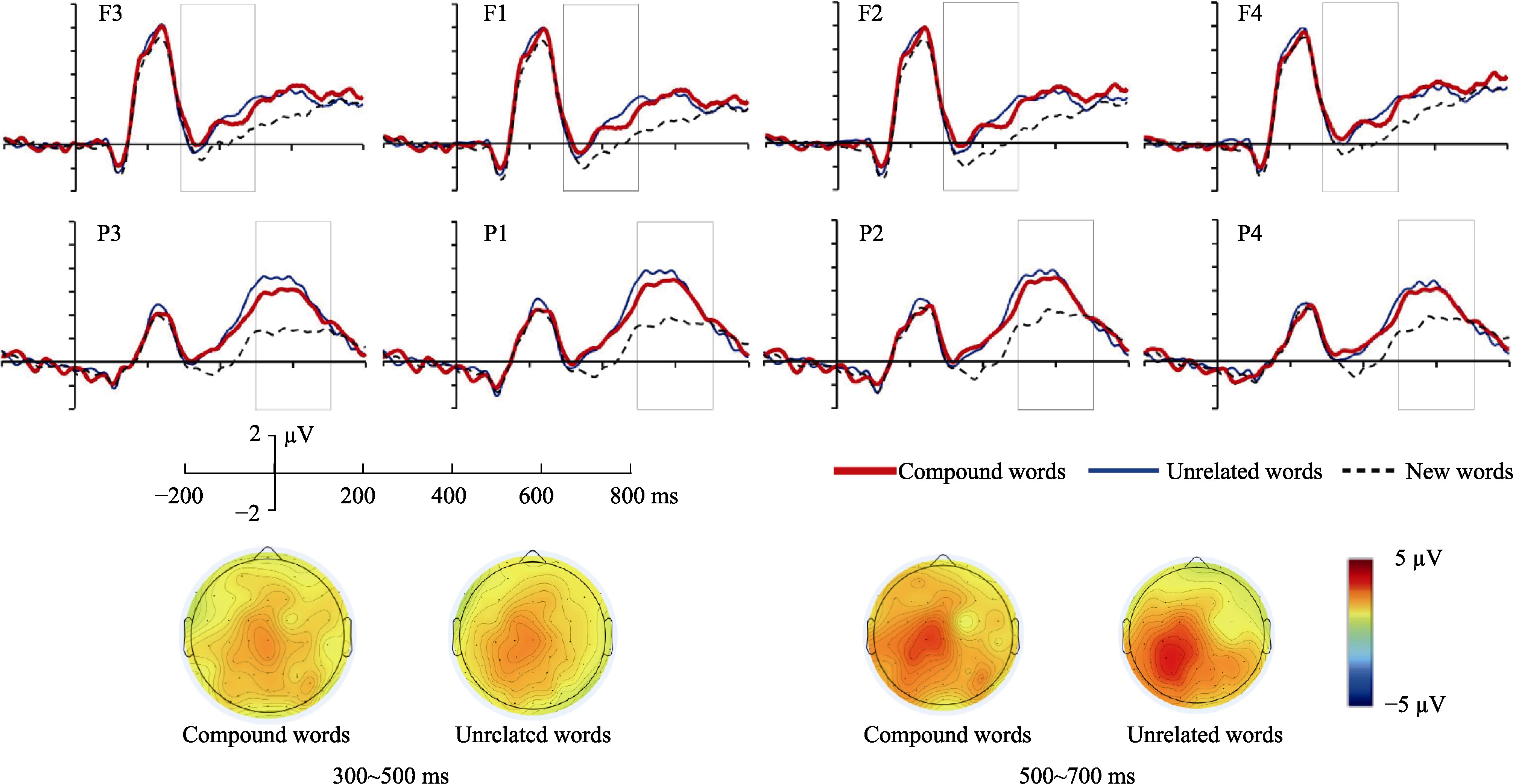 图2老年人在复合词和无关词条件下的额区和顶区新/旧效应及地形图